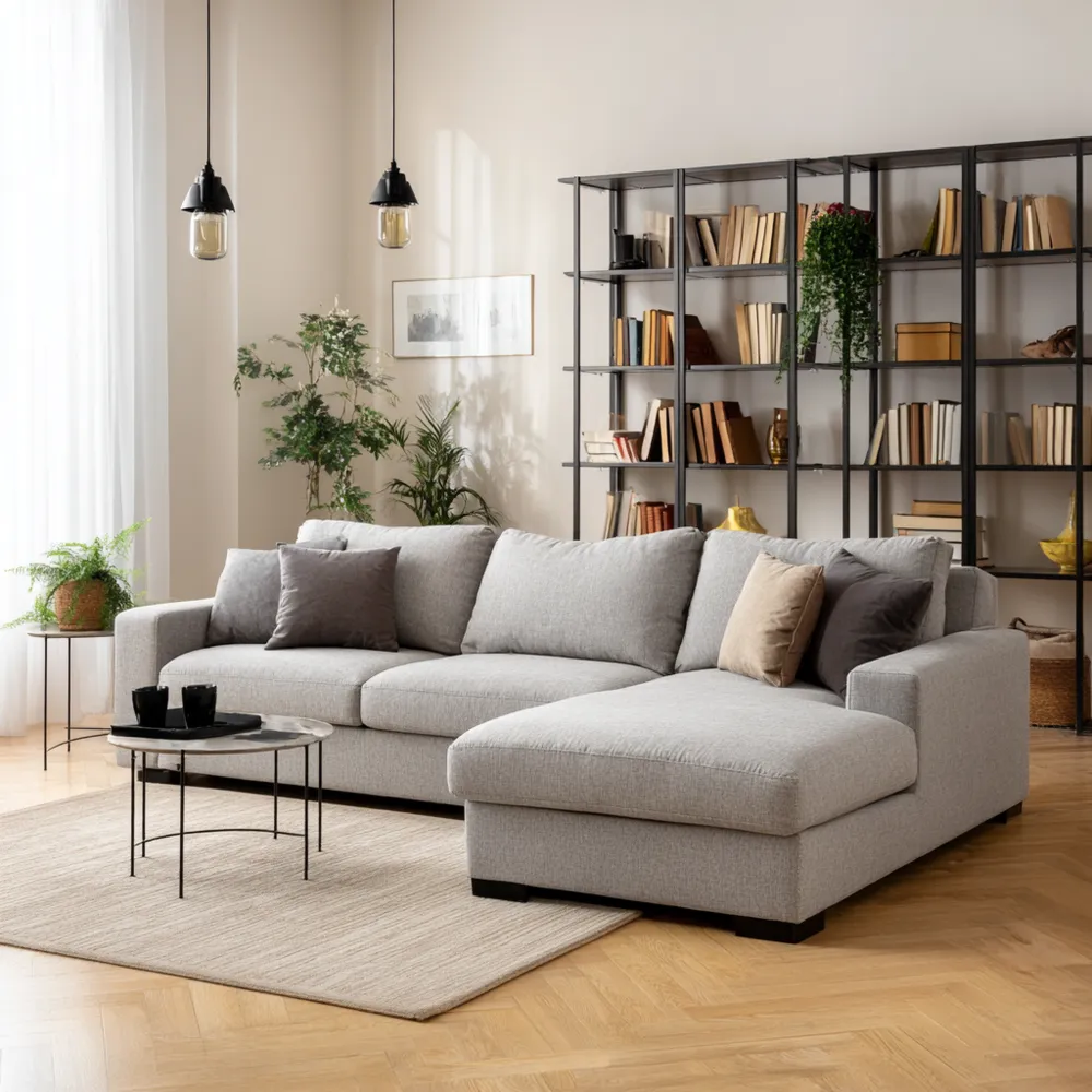 Sofa-Set mit Stoffbezug in Hellgrau.